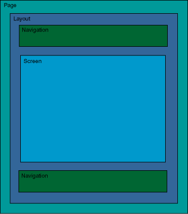 A website generally has a top and bottom navigation scheme. This is generally defined as the header and footer of the website. The Navigation is executed by the Layout. There may be multiple Navigation modules that the Layout executes (ie: the side, top and bottom parts of the page). Since it is generally common for multiple webpages to contain the same navigation, it is most common to define different Layouts for screens with very different Navigations. The advantage of using a system like this is that you can have multiple Navigations that are conditionally included and excluded in the Layout. Like Screens, the Navigation modules can also call out to external code, such as EJB's to get the business logic that is responsible for rendering the Html that is sent to the browser.